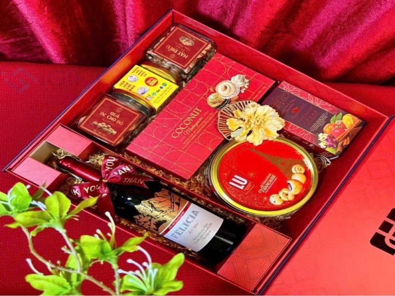 Giỏ quà bên cạnh các loại bánh kẹo cao cấp, còn đi kèm là 1 chai rượu vang, trà với trang trí vô cùng bắt mắt, sang trọng. Đây là món quà mà bạn có thể biếu, tặng cho mọi đối tượng người nhận trong dịp năm mới.