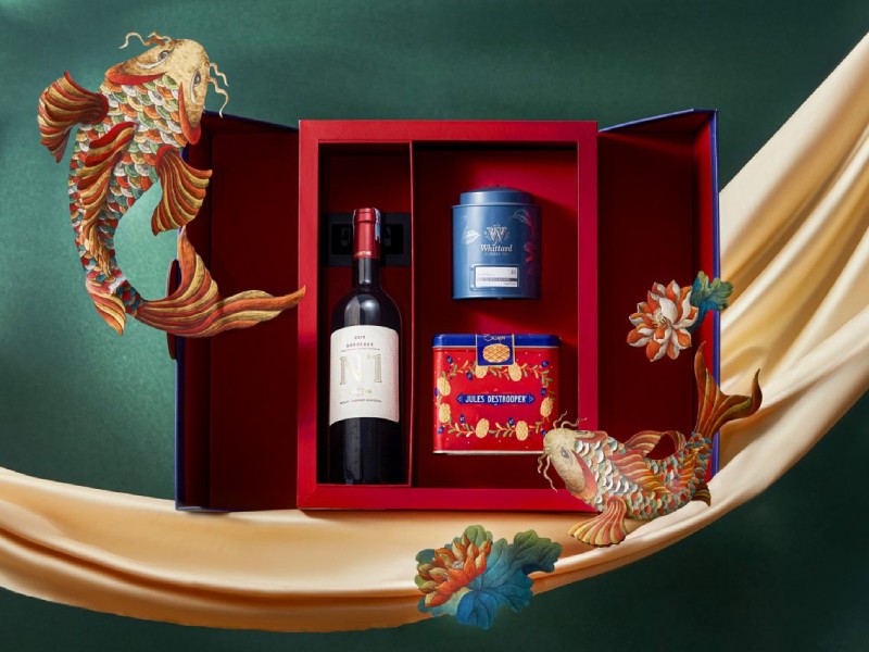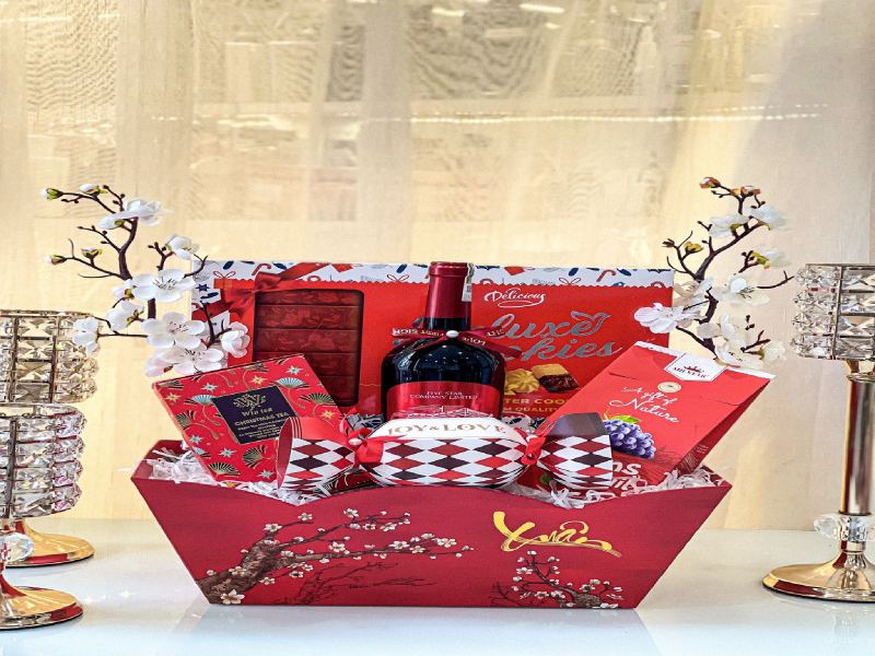 Hộp quà với các sản phẩm tông đỏ chủ đạo phù hợp với không khí Tết